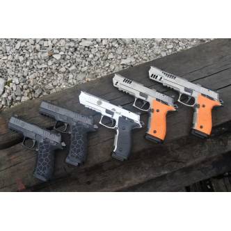 La serie completa de pistolas Luger de 9 mm de Steyr Arms. De izquierda a derecha: la ATd Compact y la ATd Compact Comp, la ATc Base 5" (blanca con cachas negras) y el dúo ATc "Rock": pistolas de carreras idénticas disponibles con cañones de 5" y 6", gatillos SAO optimizados y cachas naranjas de alta visibilidad.