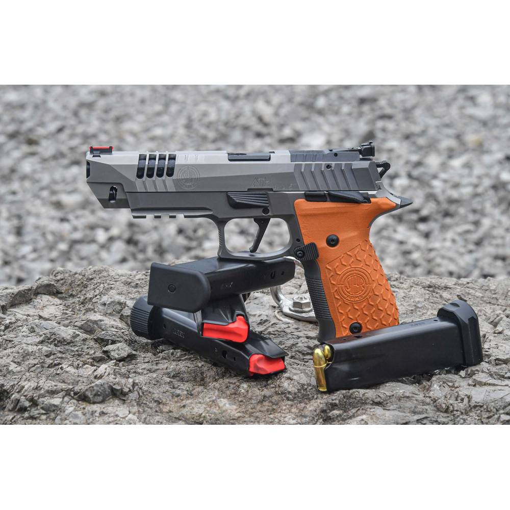 Sin embargo, en comparación con las pistolas convencionales de tamaño completo, la ATc/ATd se siente sorprendentemente baja, debido principalmente al retén del cargador, más alto en ambos lados, que permite al tirador sujetarlo ligeramente más alto. Esto no solo mejora el control del retroceso, sino que también proporciona un gatillo más ergonómico.